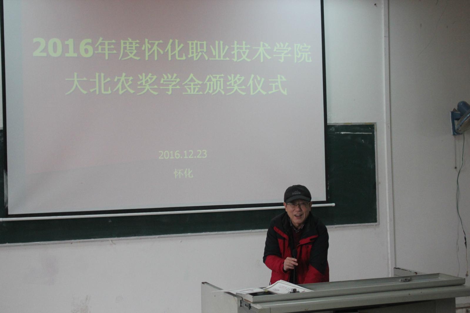 1223日下午,我院在梯一教室举行2016年度大北农励志奖学金颁奖仪式。副院长张圣喜、教务处处长罗毅华、湖南金色农华公司经理罗立文出席仪式,大北农股份有限公司工作人员、环境与生物科技系全体老师及学生代表参加了本次颁奖仪式。